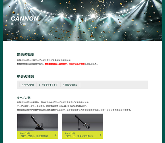 キャノン砲とは、炭酸ガスの圧力を利用し、筒内に仕込んだテープや紙吹雪を飛ばす演出機材です。キャノン砲を日本で最初に開発、実用化し、特殊効果演出の代表格の礎を築いたのは弊社です。